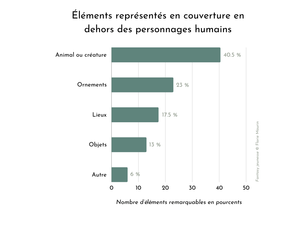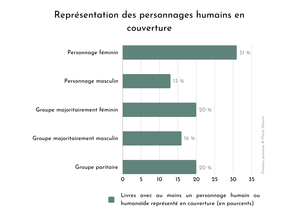 Quels sont les éléments ou personnages remarquables[39] les plus représentés dans les illustrations de couverture ? Si l’illustration comporte au moins un personnage humain ou humanoïde, il est majoritairement féminin (31 %). Arrivent ensuite les groupes paritaires de personnages (20 %) et les groupes majoritairement féminins (20 %).