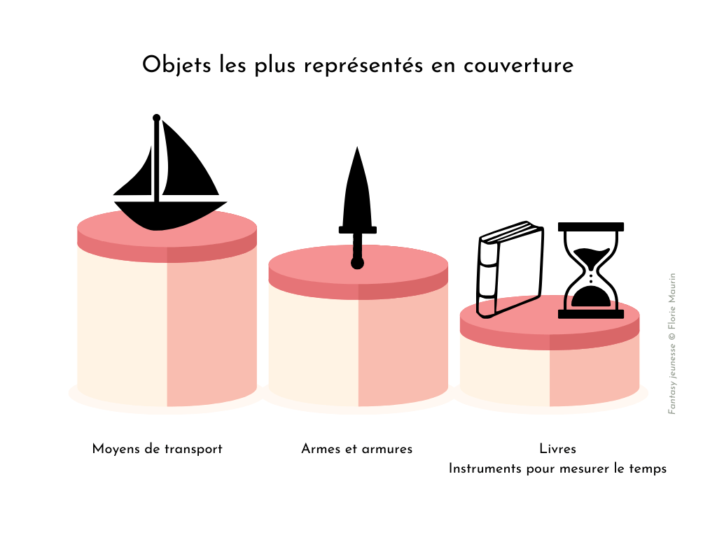 Le palmarès des objets les plus représentés est composé des moyens de transports (particulièrement les bateaux), des armes et armures (surtout des armes blanches, ce qui n’a rien de surprenant dans le genre de la fantasy, souvent préindustrielle), puis, en troisième position ex-aequo, nous trouvons les livres et les instruments pour mesurer le temps (montre, horloge, sablier, astrolabe) dont la puissance symbolique est certainement inspirante pour les littératures de l’imaginaire.