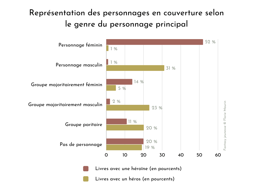 Par ailleurs, les personnages estimés comme féminins sont quasiment deux fois plus représentés en couverture des romans avec des héros que ne le sont les personnages masculins dans les romans avec des héroïnes (rapport de 1,9).