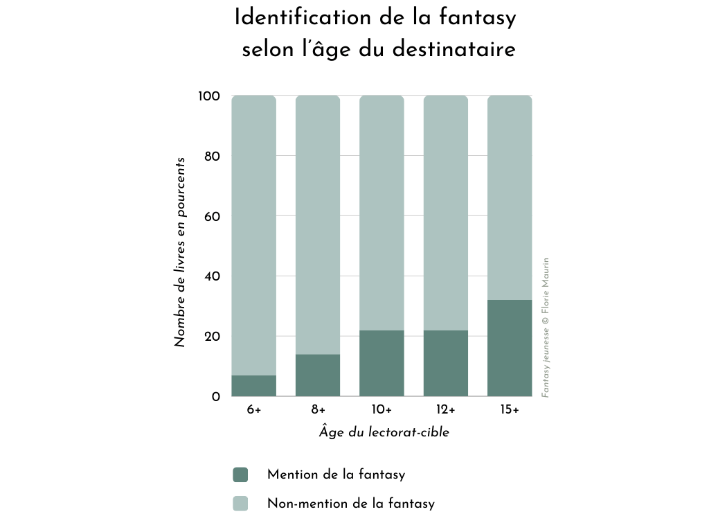 Un des éléments marquants des publications de fantasy jeunesse est le faible emploi du terme « fantasy » par les maisons d’édition : seules 18 % des publications sont présentées comme relevant de la fantasy sur les sites internet des maisons. Il est intéressant de préciser que les livres destinés à un public plus âgé sont plus régulièrement présentés comme appartenant au genre : la mention de la fantasy semble augmenter en fonction de l’âge du destinataire. Dans notre échantillon, plus le destinataire est âgé, plus il y aura de chances que la maison d’édition rende le genre visible.