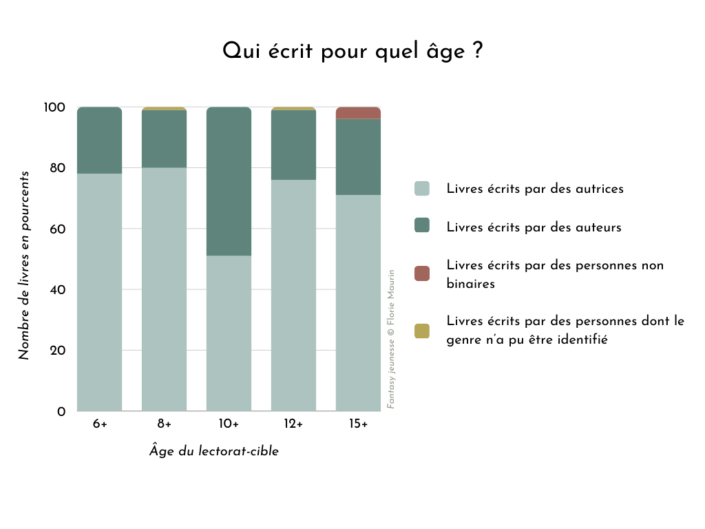 Comme nous l’avons vu, les autrices sont plus nombreuses en littératures de jeunesse lorsque les livres s’adressent aux plus jeunes. Dans la fantasy jeunesse publiée en 2023, nous ne notons que peu de variations du pourcentage d’autrices selon l’âge du destinataire-cible des romans (entre 71 % et 80 % de livres écrits par des femmes pour les 6+ / 8+ / 12+ et 15+). Quel que soit l’âge du destinataire-cible, les autrices sont majoritaires.