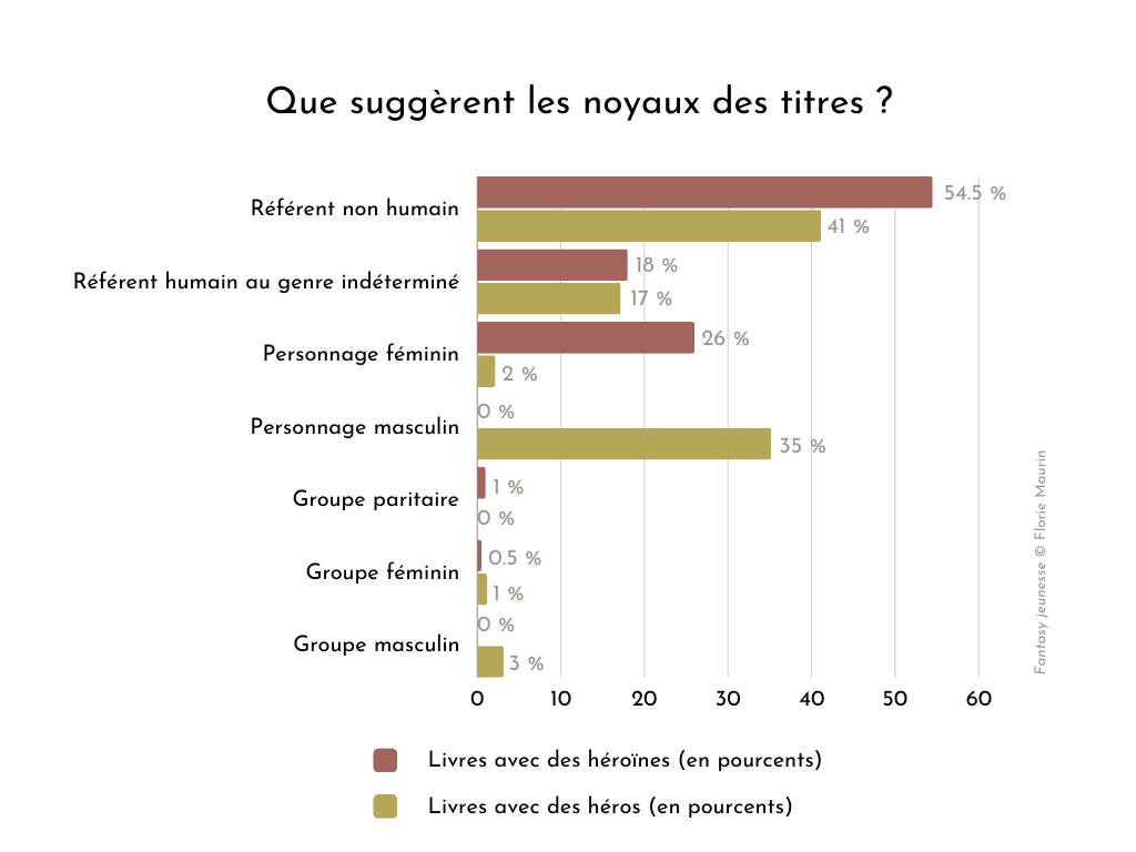 Pour plus de précisions, intéressons-nous spécifiquement aux romans avec des héroïnes et à ceux avec des héros, de façon indépendante. Dans les romans avec des héroïnes, les titres ont majoritairement un noyau renvoyant à un référent non humain (54,5 %), comme Les Arcanes de brume, et seuls 26 % des titres ont un noyau renvoyant à un personnage féminin (La Tourneuse de vent).