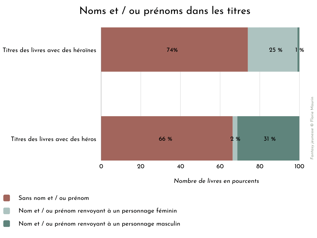 - les noms et / ou prénoms renvoyant à un personnage féminin apparaissent dans 25 % des livres avec des héroïnes